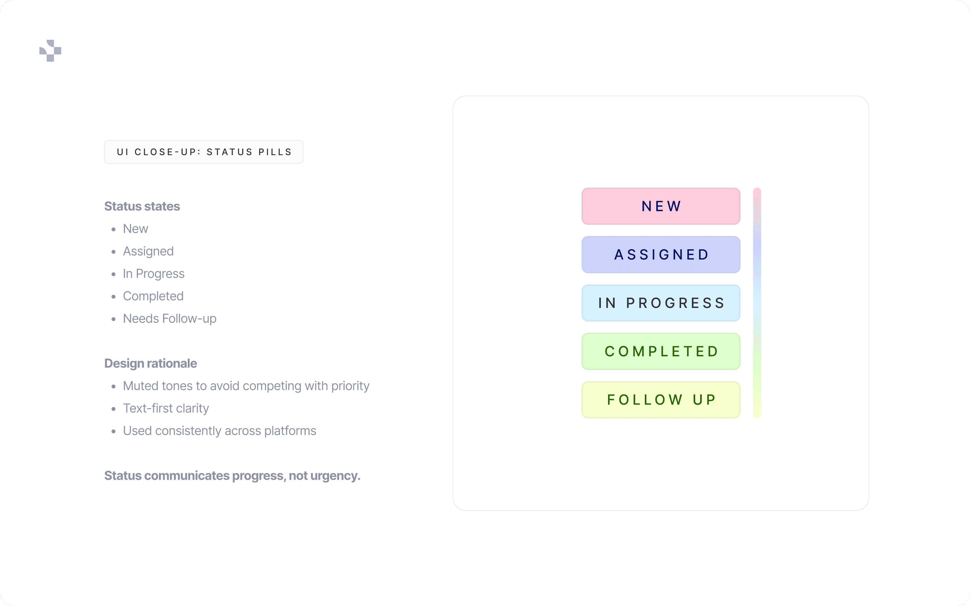 • Muted status indicators to avoid visual conflict