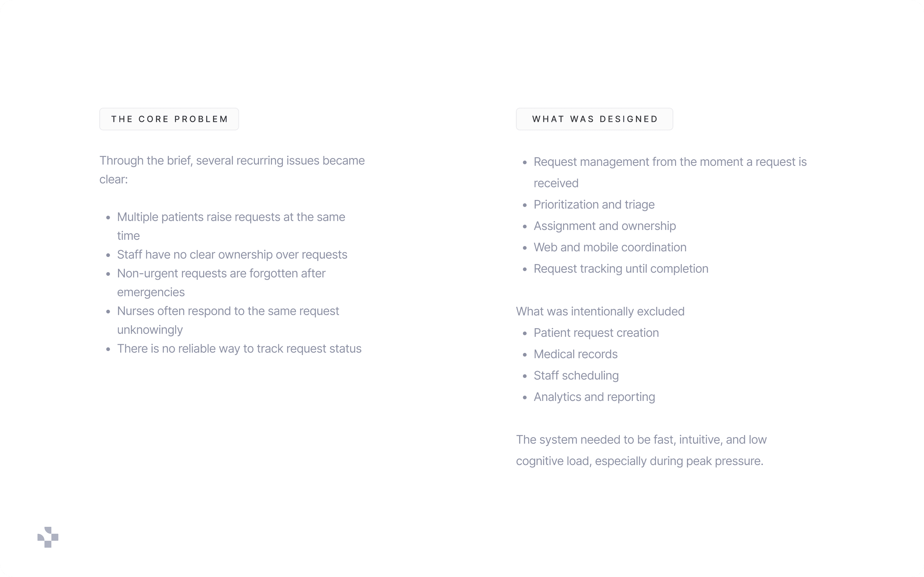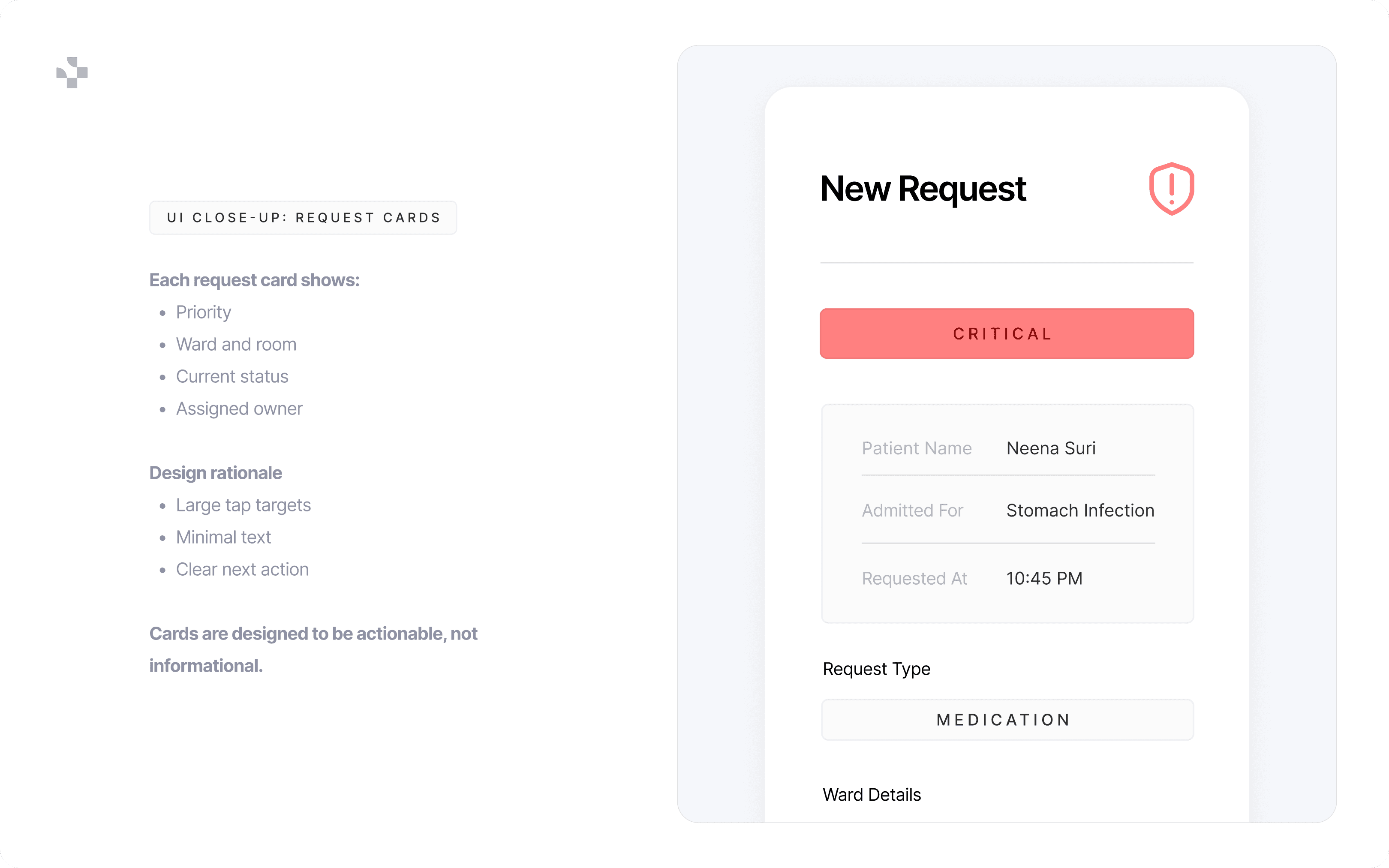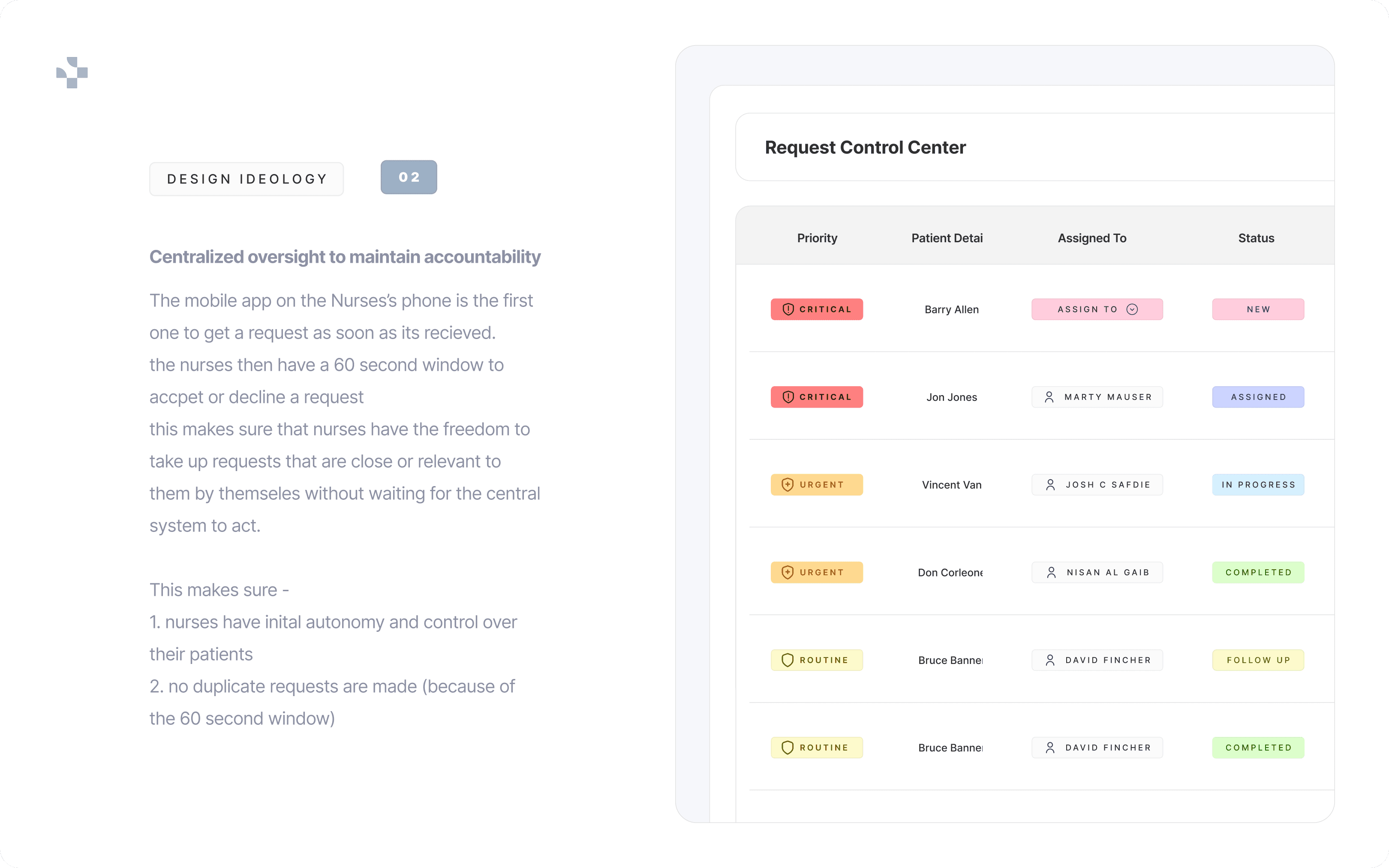 The redesigned system introduced structured coordination without adding operational friction. By separating urgency from status and empowering nurses with controlled autonomy, the workflow became faster and more accountable.