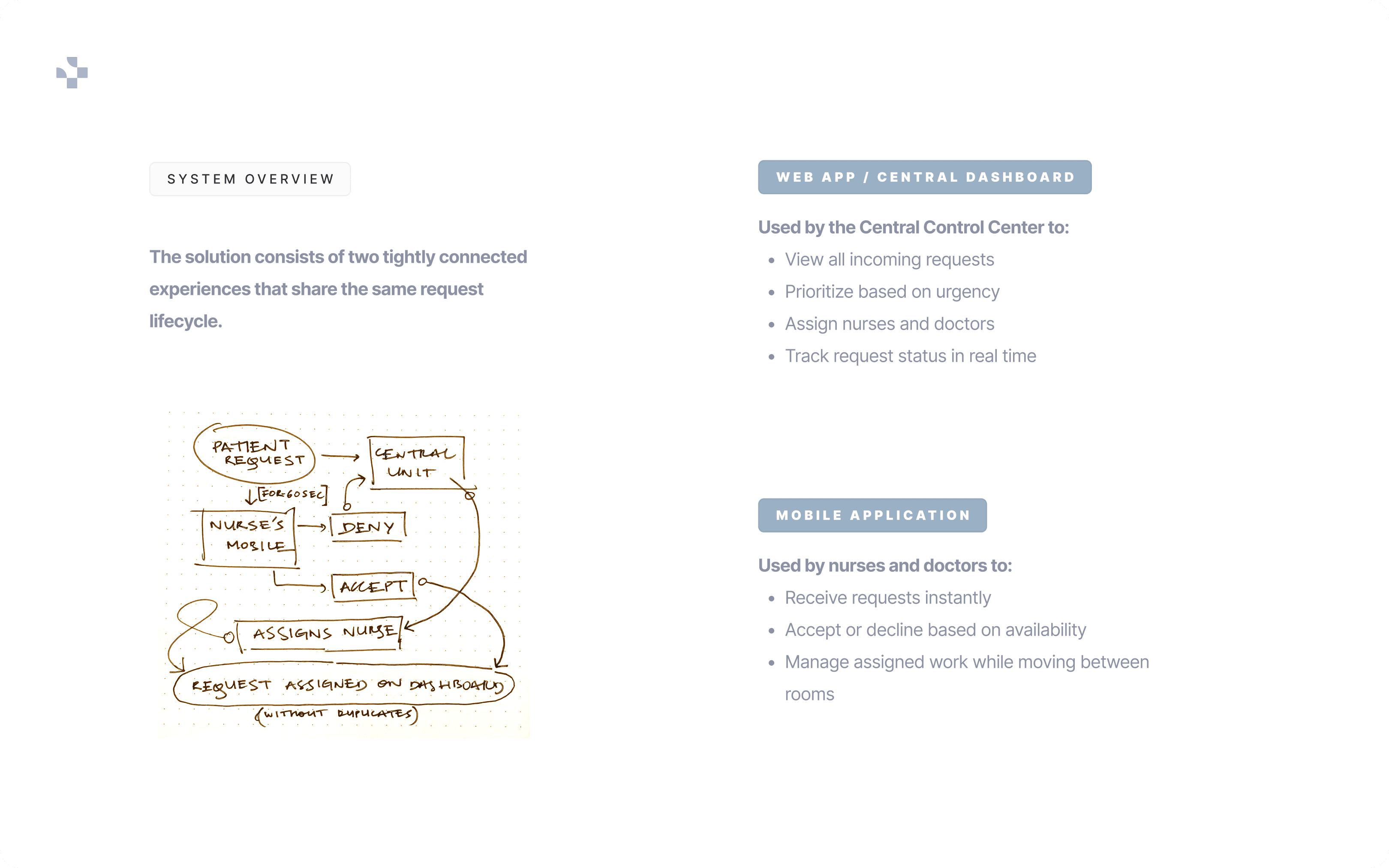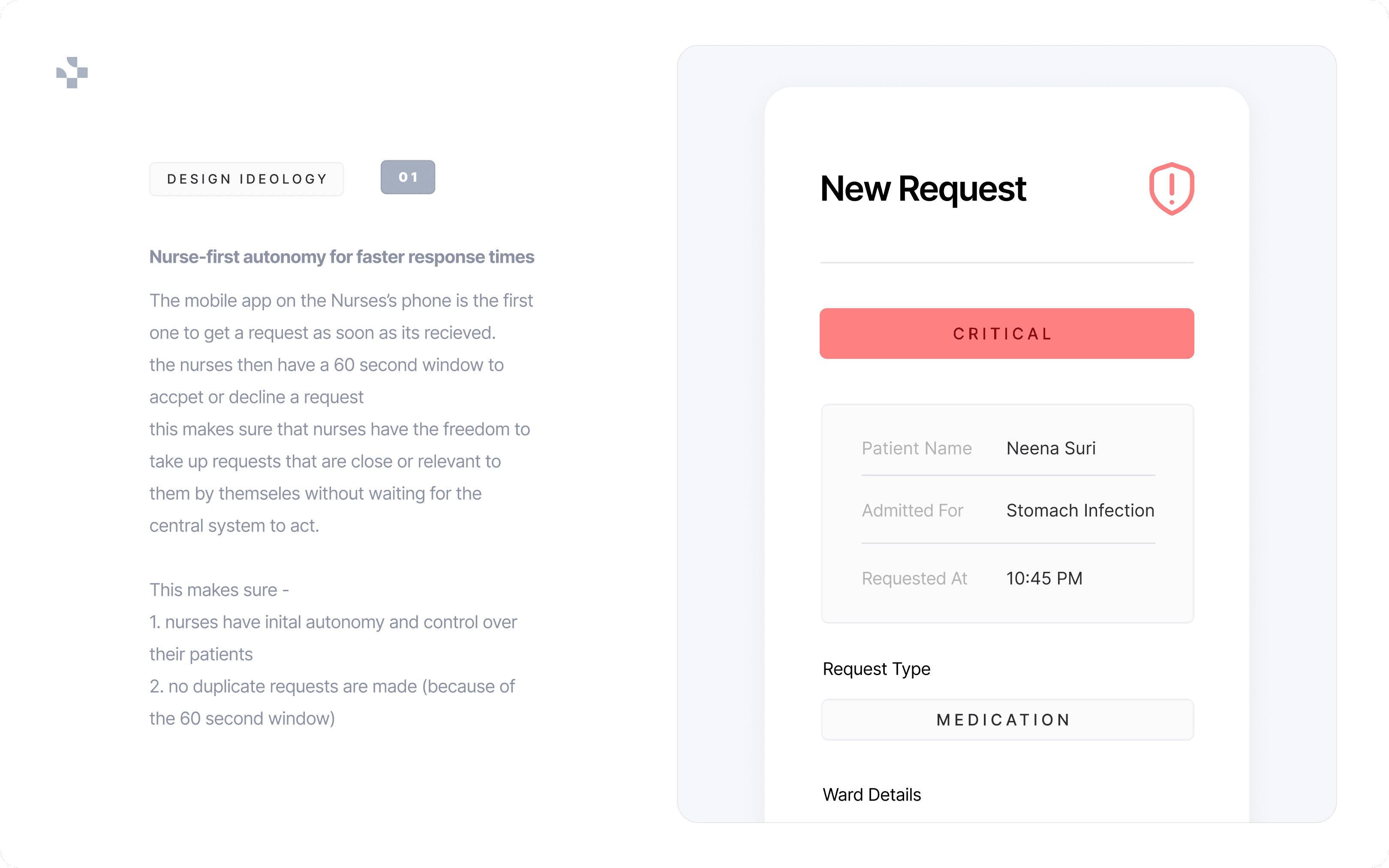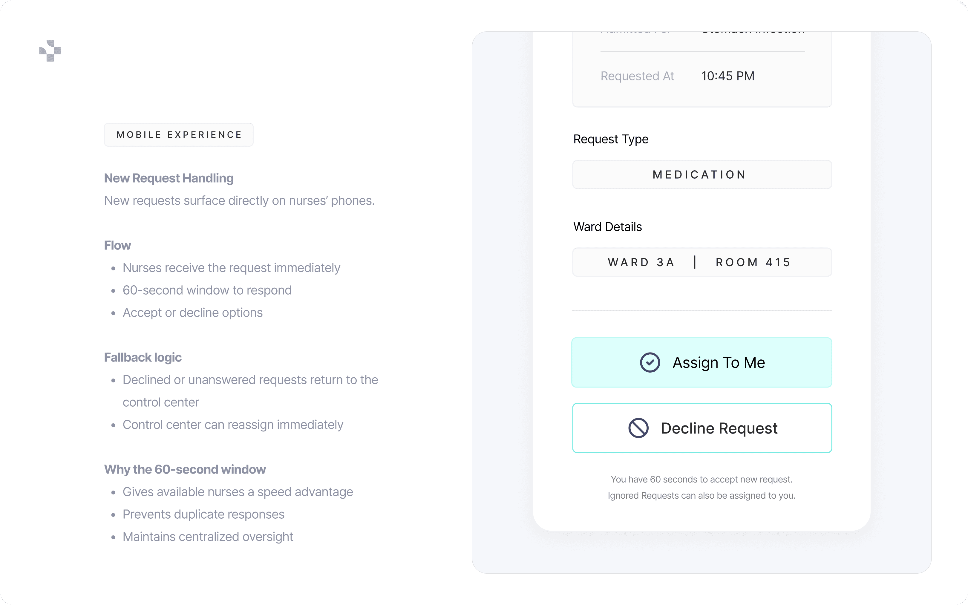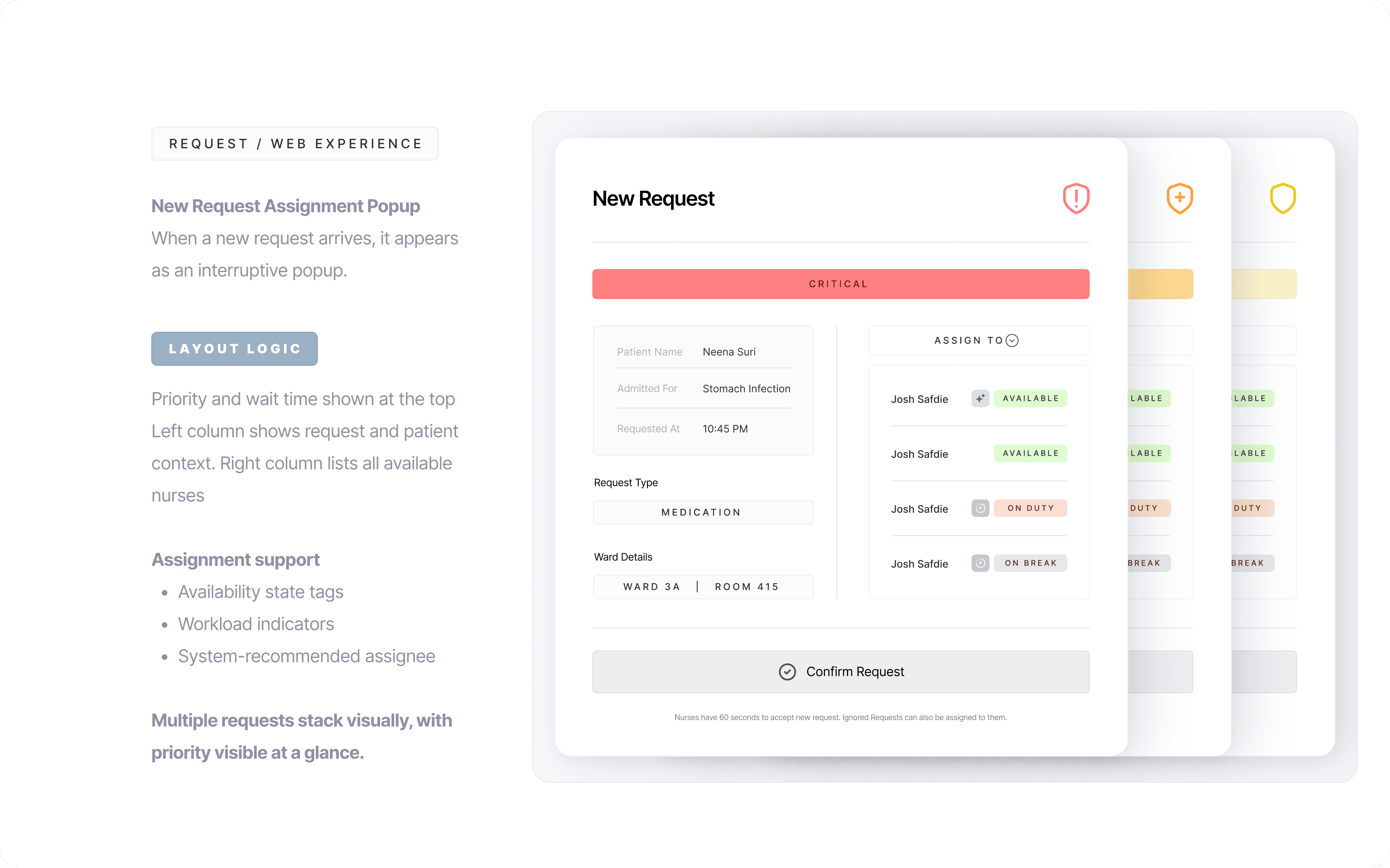 The redesigned system introduced structured coordination without adding operational friction. By separating urgency from status and empowering nurses with controlled autonomy, the workflow became faster and more accountable.