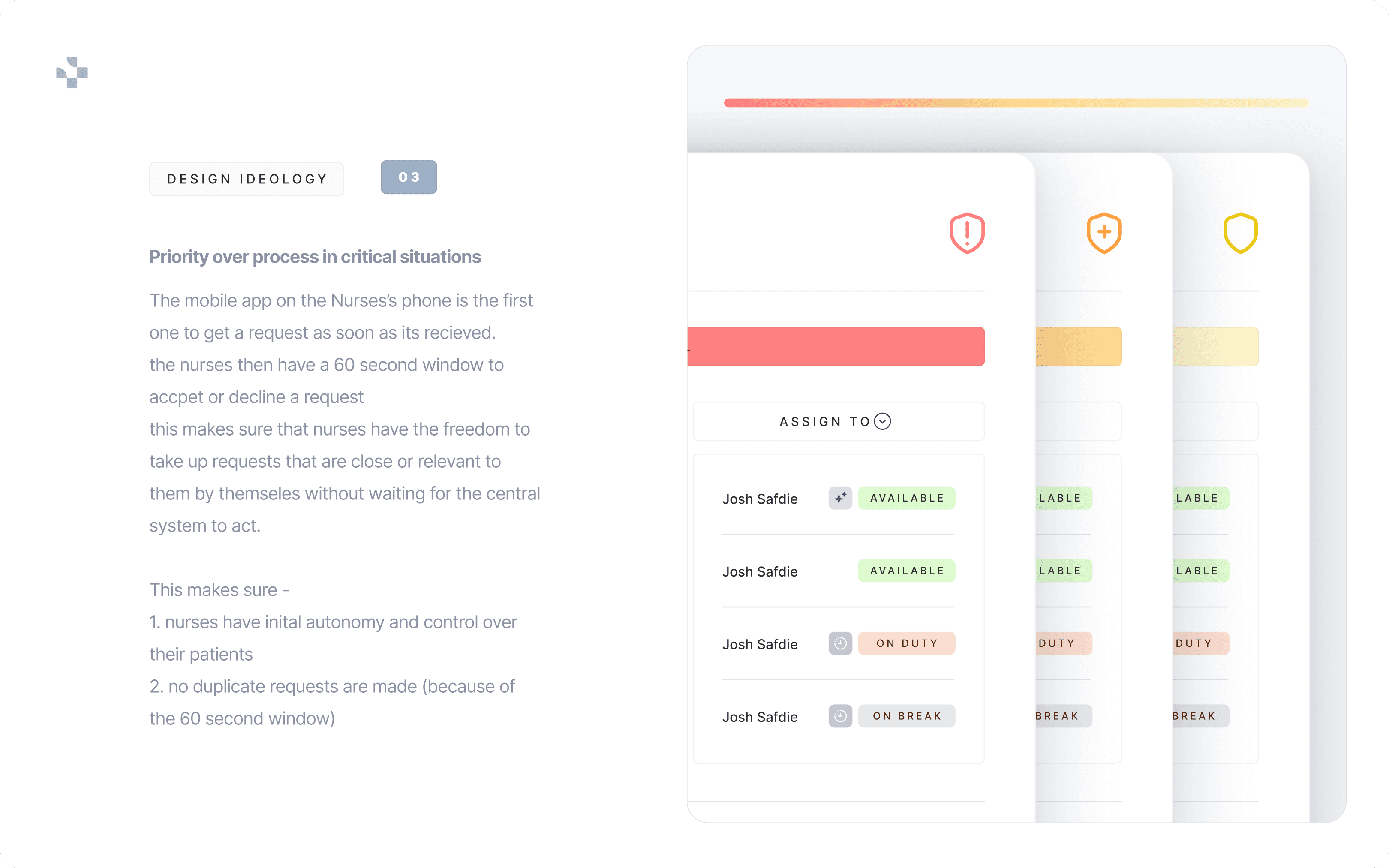 Design a system that enables fast triage, clear accountability, and nurse autonomy while preserving centralized oversight. The solution needed to function under pressure without increasing cognitive load.
