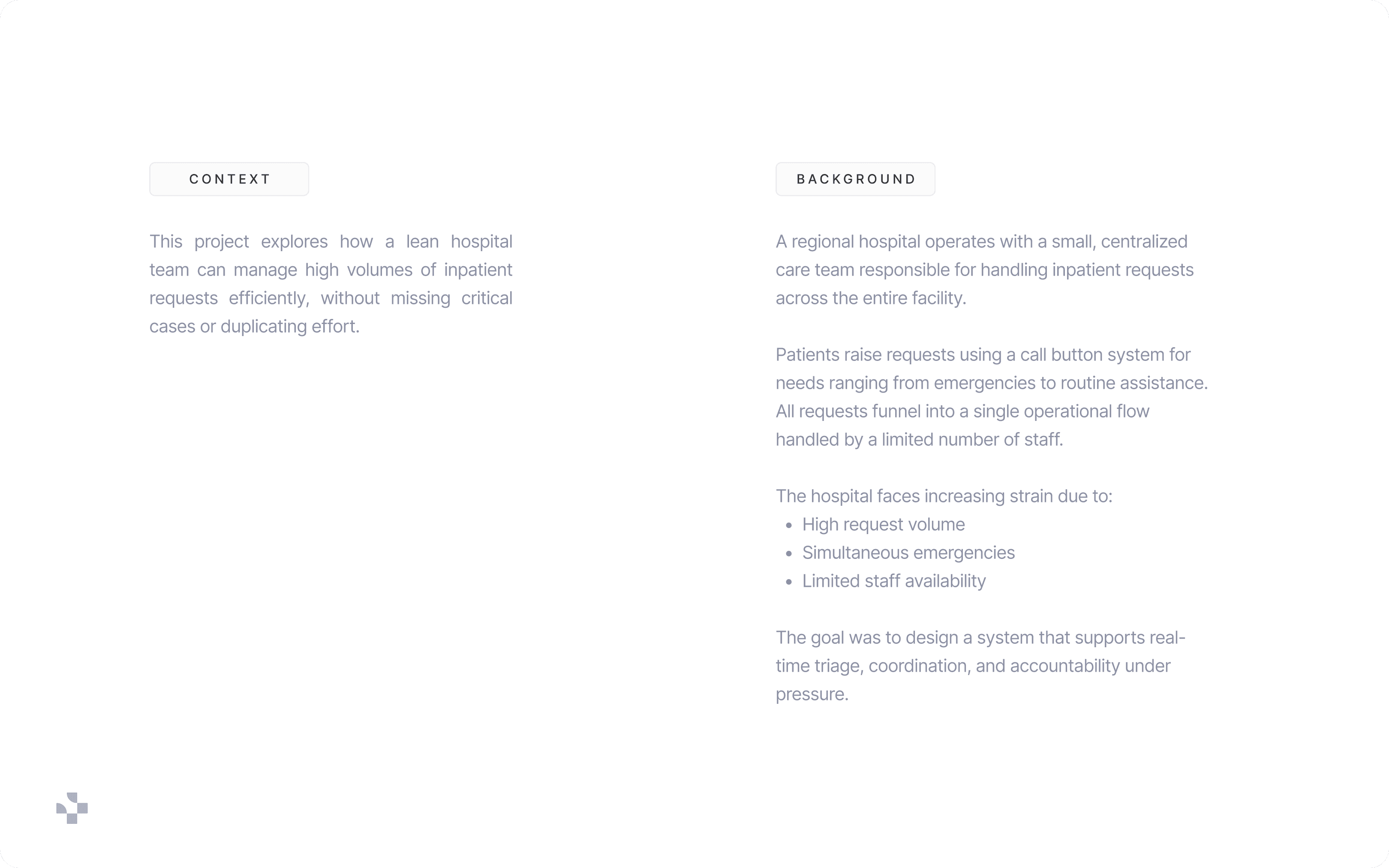 A regional hospital operates with a lean, centralized care team responsible for managing all inpatient service requests. As patient volumes increase, simultaneous requests create operational strain and increase the risk of delayed responses.