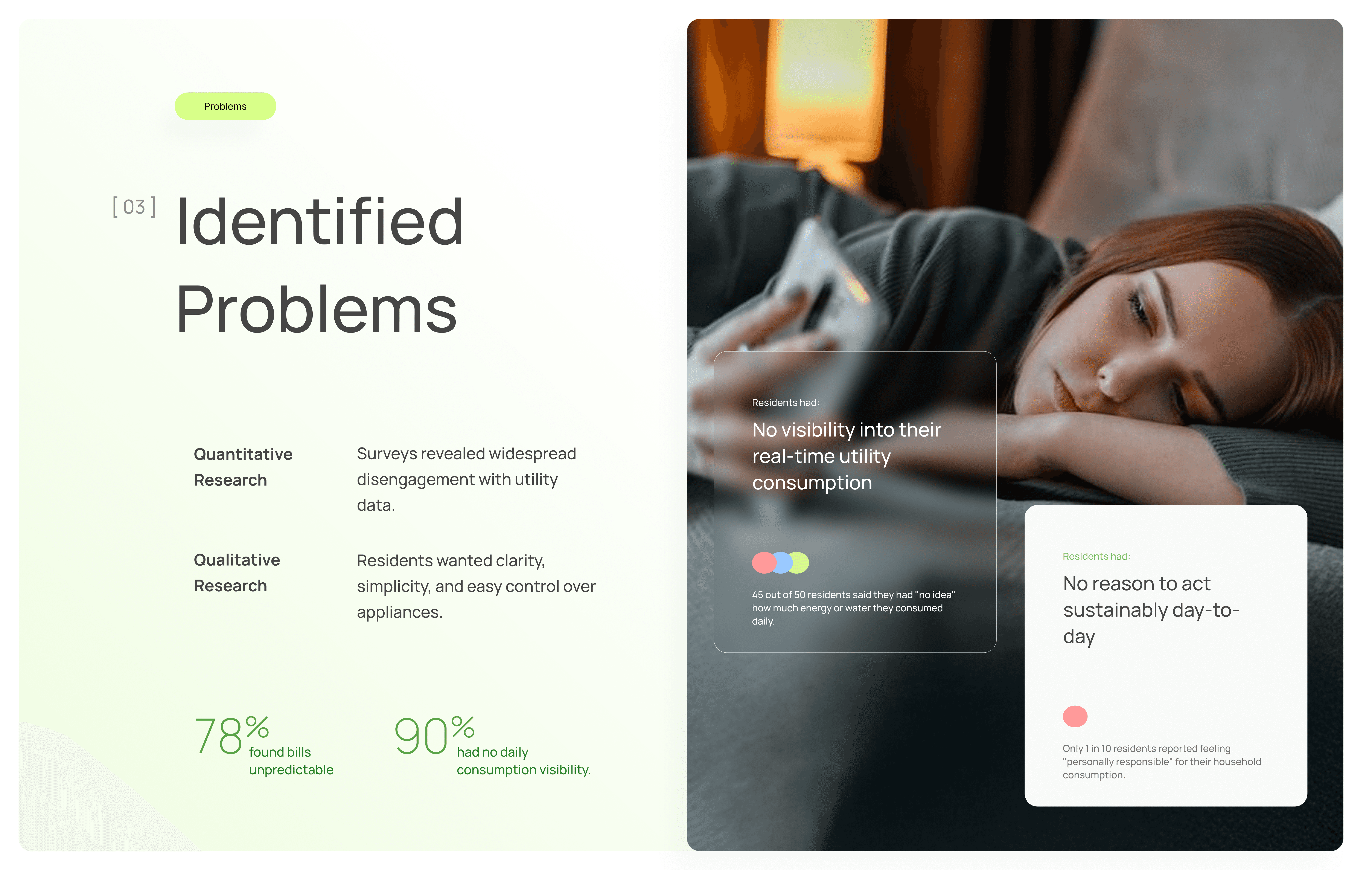 Residents in modern and future cities lack awareness and control over their resource consumption. Usage data is delayed, fragmented, and presented in technical formats that discourage engagement. As a result, sustainability remains an abstract concept rather than a daily habit, leading to inefficient usage, anxiety around billing, and missed opportunities for behavioral change.