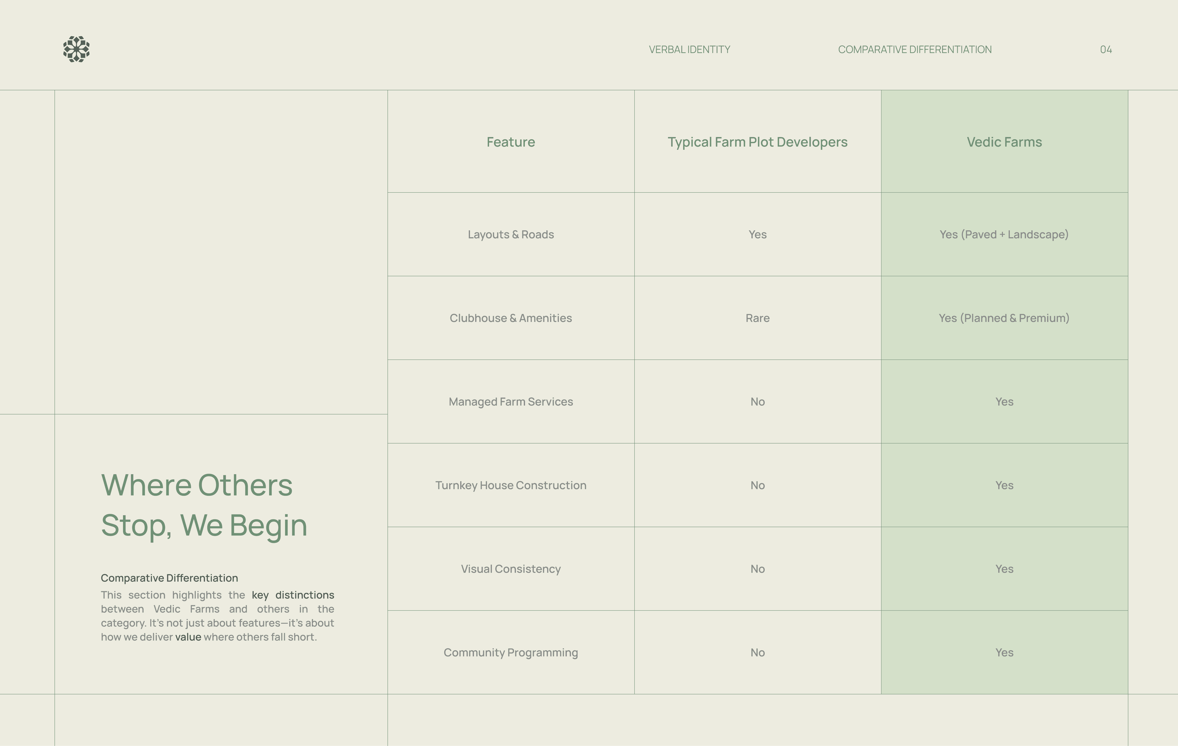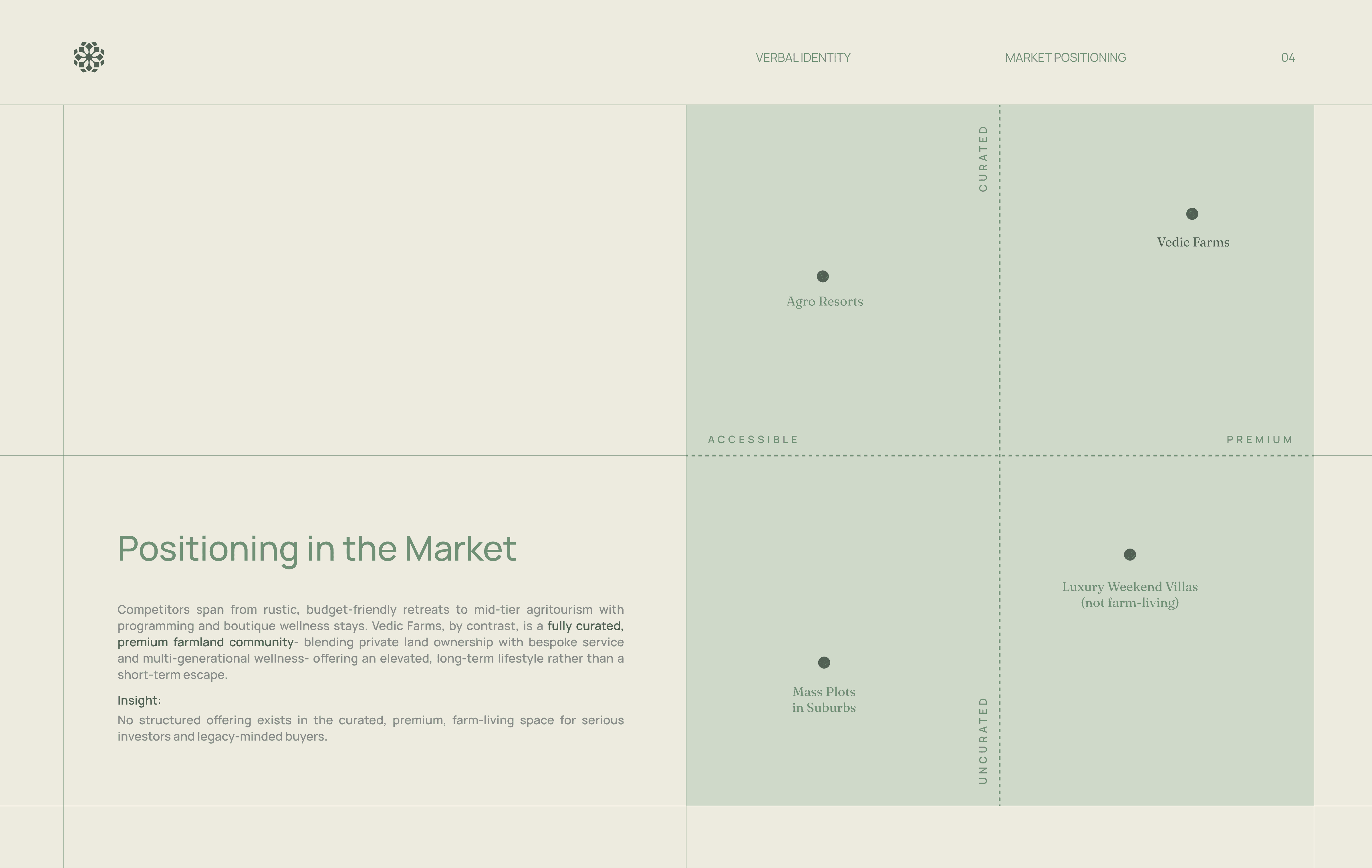 Vedic Farms introduced farmhouses as a primary residential product, targeting high net worth buyers seeking privacy, land ownership, and long term lifestyle value. The brand sits between luxury real estate and nature driven living in an emerging, undefined market.